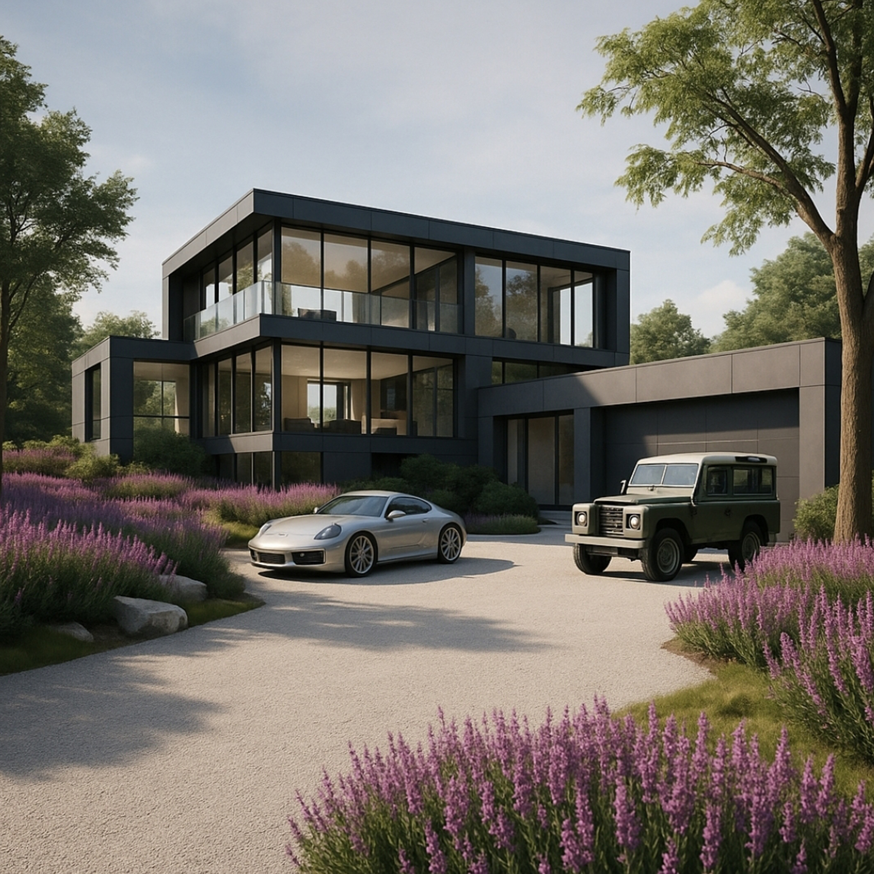 This residence in Amagansett features a sleek, modernist design defined by clean lines, flat roofs, and a bold rectilinear composition. The façade is dominated by expansive floor-to-ceiling glass panels framed in dark cladding, creating a striking contrast while maximizing natural light and views of the surrounding landscape. The structure emphasizes horizontality, with cantilevered sections and projecting volumes that enhance its sculptural quality. The landscape design complements the architecture, with a minimalist gravel driveway softened by lush lavender plantings that introduce color and texture. The pairing of luxury vehicles in the foreground further reinforces the contemporary, high-end lifestyle aesthetic typical of Amagansett’s modern architectural movement.
