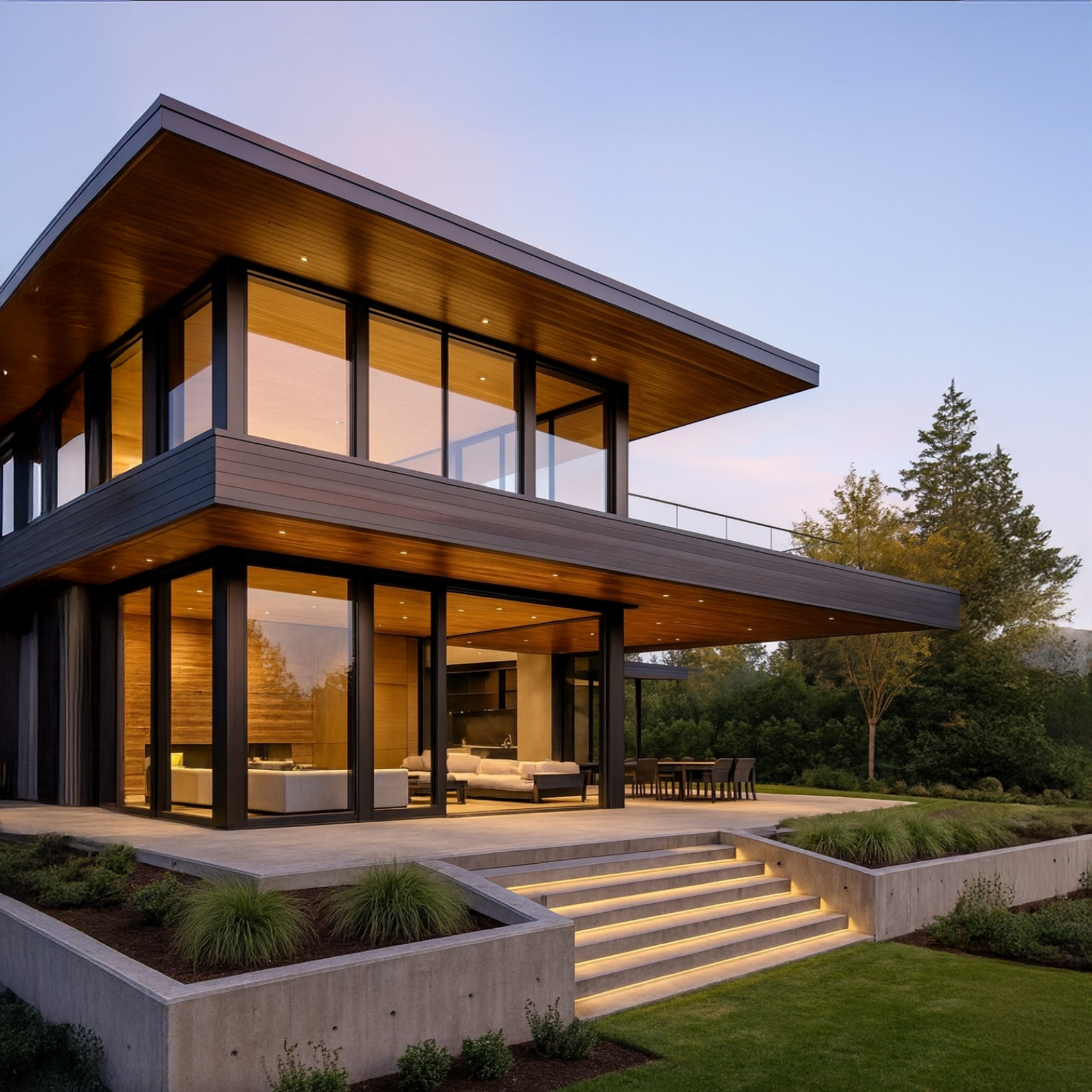 This residence embodies a sleek modernist design, characterized by strong horizontal lines, expansive glazing, and minimalist detailing. The structure makes extensive use of floor-to-ceiling glass panels framed in dark metal, creating a seamless connection between indoor and outdoor living. A cantilevered upper floor emphasizes the geometric composition while providing shade and visual drama. Warm wood soffits and ceiling finishes soften the contemporary palette, balancing the concrete base and crisp black frames. Clean landscaping and integrated lighting along the entry stairs further enhance the architectural clarity, presenting a sophisticated blend of modern luxury and functional elegance.