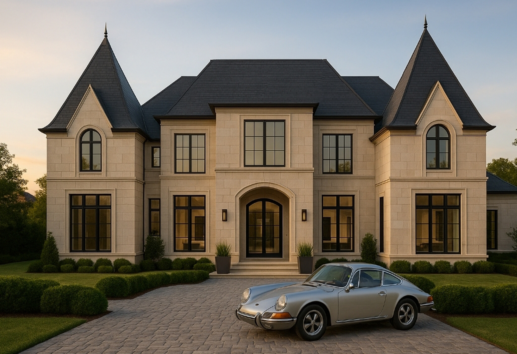 This project in Sands Point showcases a refined French château–inspired design, defined by its symmetrical façade, steep slate-style hip roofs, and elegant stone cladding. The twin towers with pointed spires on either side provide a stately, almost castle-like presence, while the large arched entryway framed in stone emphasizes a sense of grandeur. Expansive black-trimmed windows balance the traditional form with a contemporary edge, creating bright interiors while maintaining strong curb appeal. The manicured landscaping and cobblestone driveway enhance the timeless elegance, further elevated by the presence of a vintage European sports car, reinforcing the property’s understated sophistication.