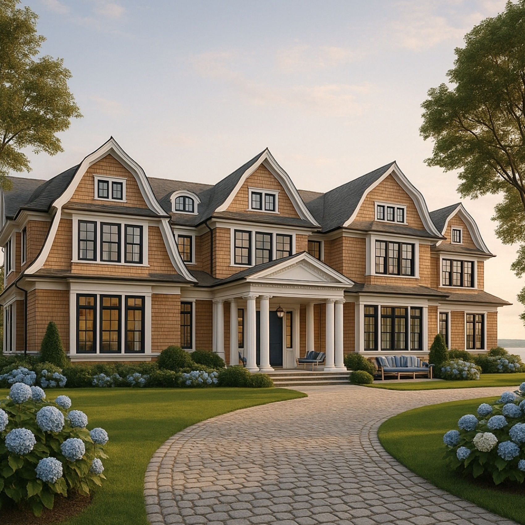 This home embodies classic Hamptons-style architecture, blending elegance with coastal charm. The exterior showcases warm cedar shake siding paired with crisp white trim, a hallmark of the region’s design language. Multiple steeply pitched gables and dormers create a dynamic roofline, while black-framed windows add a modern contrast to the traditional detailing. The grand front portico, supported by classical columns, emphasizes symmetry and formality, evoking timeless East Coast sophistication. A sweeping cobblestone driveway framed by manicured lawns and lush hydrangea plantings enhances the welcoming, estate-like feel. Altogether, the design reflects a balance of grandeur and relaxed coastal living, characteristic of luxury residences in the Hamptons.