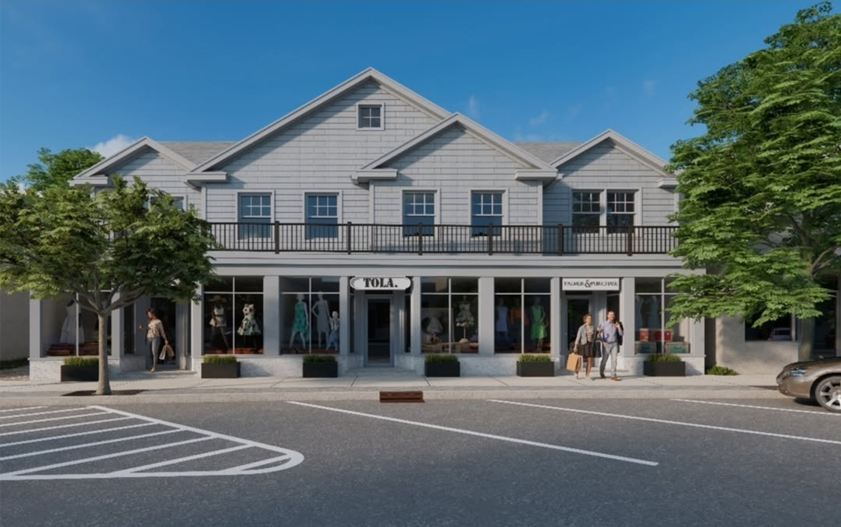 At street level, the structure hosts modern storefronts with large glass display windows framed by streamlined columns, creating a boutique retail experience. The use of recessed entryways and low-profile planters adds pedestrian-scale texture and invites foot traffic. Flanking street trees enhance the walkability and soften the urban edge. Above, the residential or office level is discretely integrated into the roofline, balancing mixed-use functionality with architectural cohesion. This design successfully bridges classic village scale with contemporary retail expectations in a polished, contextual manner.